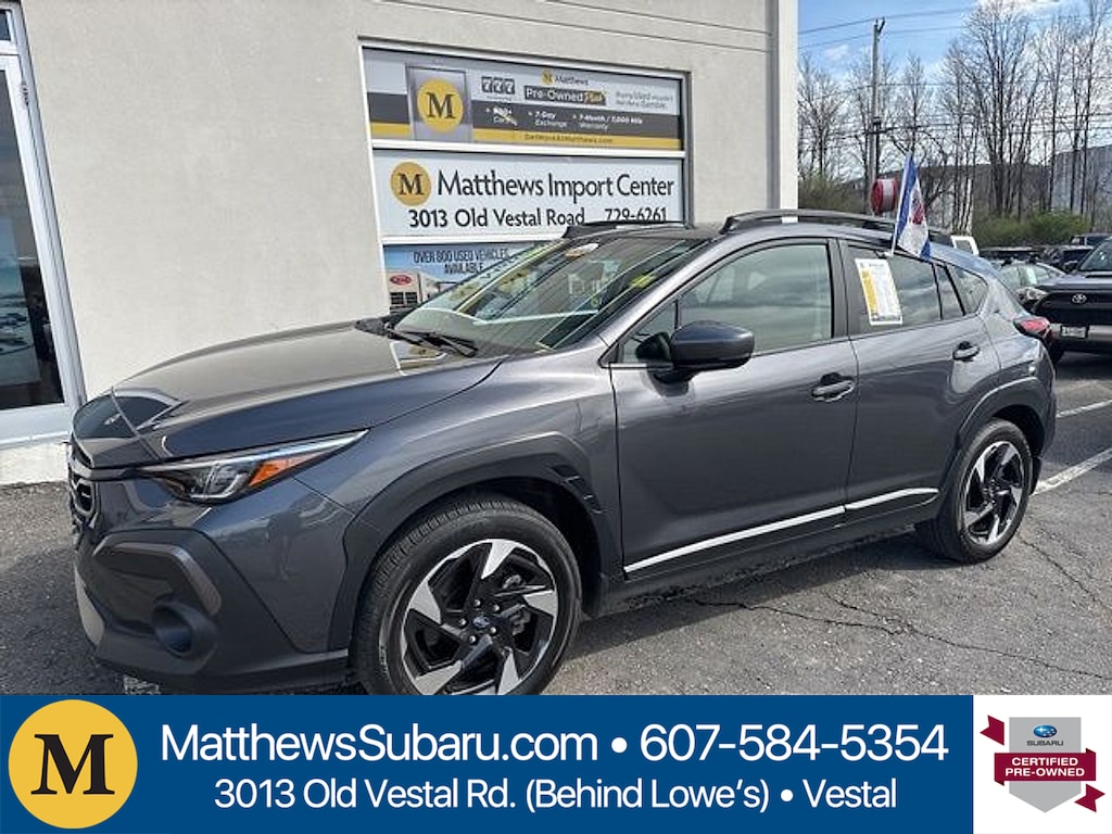 Matthews Import Center promises each customer a thorough and confident 120-point inspection on our used inventory guaranteeing a relaxing and peace-of-mind experience. We are located behind Lowes in Vestal NY. Or call us at (607) 729 - 6261Matthews Import Center3013 Old Vestal RoadVestal NY 13850. Certified. Magnetite Gray Metallic/Crystal Black Silica 2025 Subaru Limited Crosstrek AWD Lineartronic CVT 2.5L 4-Cylinder DOHC 16VOdometer is 2607 miles below market average! 27/33 City/Highway MPGSubaru Certified Pre-Owned Details: * Warranty Deductible: $0 * SiriusXM 3-Month trial subscription $500 Owner Loyalty coupon & 1 year trial subscription to STARLINK * Vehicle History * Transferable Warranty * Roadside Assistance * Powertrain Limited Warranty: 84 Month/100000 Mile (whichever comes first) from original in-service date * 152 Point Inspection