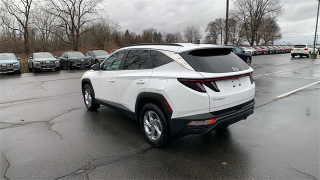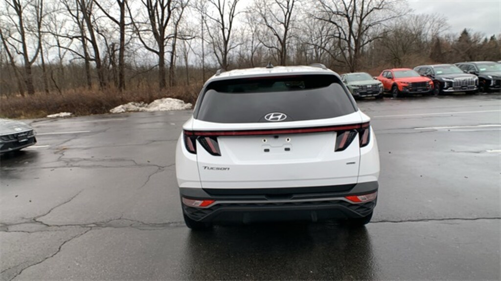Serenity White Pearl 2023 Hyundai Tucson SEL AWD 8-Speed Automatic with SHIFTRONIC 2.5L I4 DGI DOHC 16V LEV3-ULEV70 187hp AWD, 3.648 Axle Ratio, 4-Wheel Disc Brakes, 6 Speakers, ABS brakes, Air Conditioning, Alloy wheels, AM/FM radio: SiriusXM, Apple CarPlay & Android Auto, Auto High-beam Headlights, Brake assist, Bumpers: body-color, Cargo Net, Delay-off headlights, Driver door bin, Driver vanity mirror, Dual front impact airbags, Dual front side impact airbags, Electronic Stability Control, Emergency communication system: Blue Link Connected Car Service (3-year complimentary subscription), First Aid Kit, Four wheel independent suspension, Front and Rear Mudguards, Front anti-roll bar, Front Bucket Seats, Front Center Armrest, Front reading lights, Fully automatic headlights, H-Tex Seat Trim, Heated door mirrors, Heated Front Bucket Seats, Heated front seats, Illuminated entry, Low tire pressure warning, Occupant sensing airbag, Option Group 01, Outside temperature display, Overhead airbag, Overhead console, Panic alarm, Passenger door bin, Passenger vanity mirror, Power door mirrors, Power driver seat, Power Liftgate, Power steering, Power windows, Radio data system, Radio: AM/FM/HD/SiriusXM Audio System, Rear anti-roll bar, Rear Bumper Applique, Rear seat center armrest, Rear window defroster, Rear window wiper, Remote keyless entry, Roof rack: rails only, Security system, Speed control, Split folding rear seat, Spoiler, Stain & Odor Resistant Cloth Seat Trim, Steering wheel mounted audio controls, Tachometer, Telescoping steering wheel, Tilt steering wheel, Traction control, Trip computer, Turn signal indicator mirrors, Variably intermittent wipers, Wheels: 17" x 7.0J" Alloy.